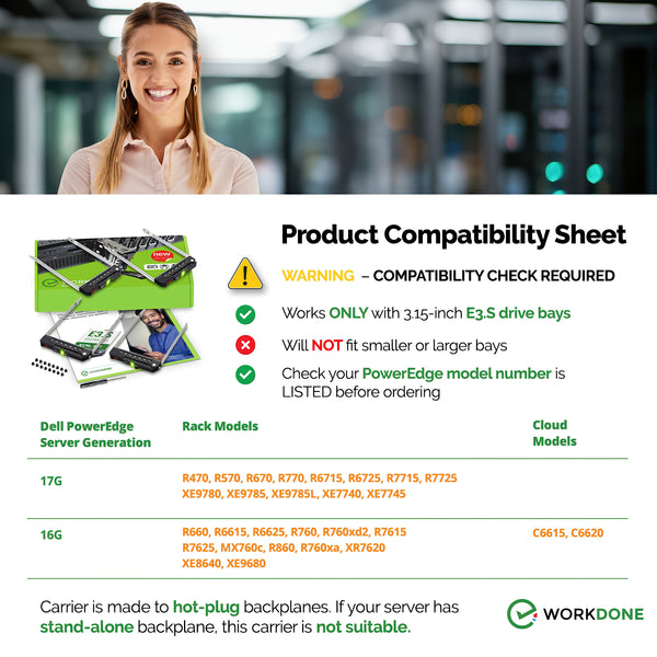 WORKDONE E3.S drive caddy set of four compatibility chart and supported systems