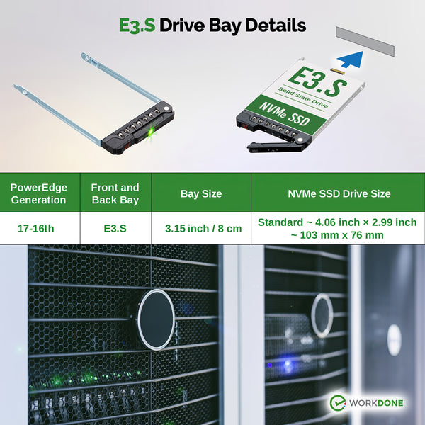 PowerEdge servers may use different drive bay sizes and standards. Verify that your server has an E3.S 3.15" Hot-Plug Drive Bay (EDSFF standard). This E3.S drive caddy supports E3.S NVMe SSD drives only and does not support SATA, SAS, or legacy SSD drive models. Please ensure your server or drive array is listed as compatible.